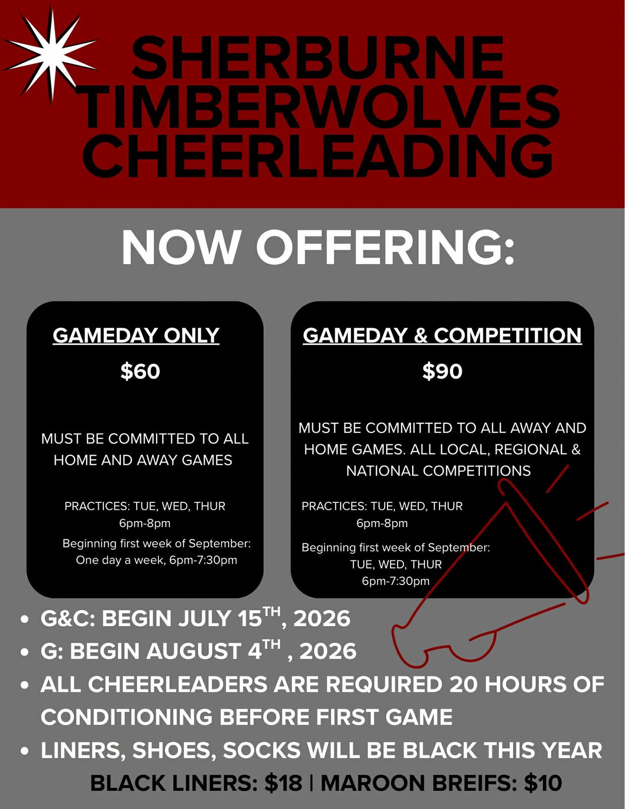 7/15/25-8/1/25: Conditioning for Cheerleading- All cheerleaders are required to complete 12 hours of conditioning during this time.